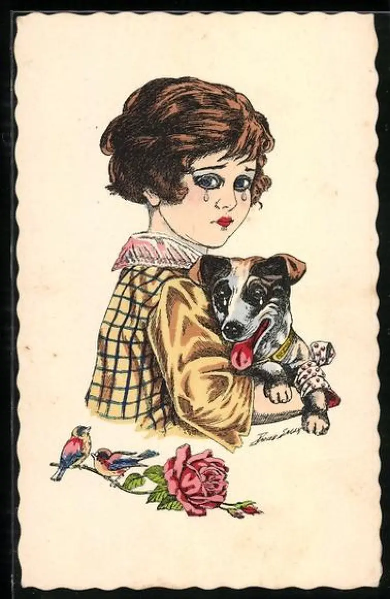 Künstler-AK Xavier Sager: Weinendes Mädchen mit weinenden Hund im Arm