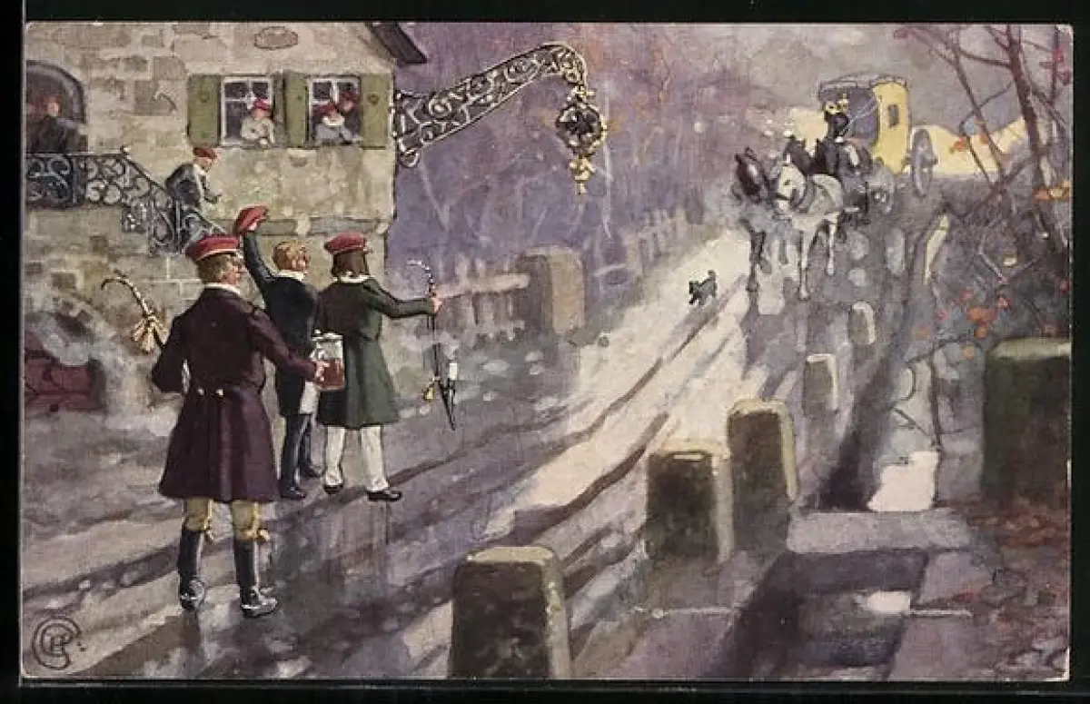 Künstler-AK Zechende Studenten vor einem Gasthaus nehmen eine Kutsche in Empfang