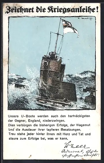 Künstler-AK Zeichnet die Kriegsanleihe!, Unsere U-Boote werden auch den hartnäckigsten der Gegner, England...