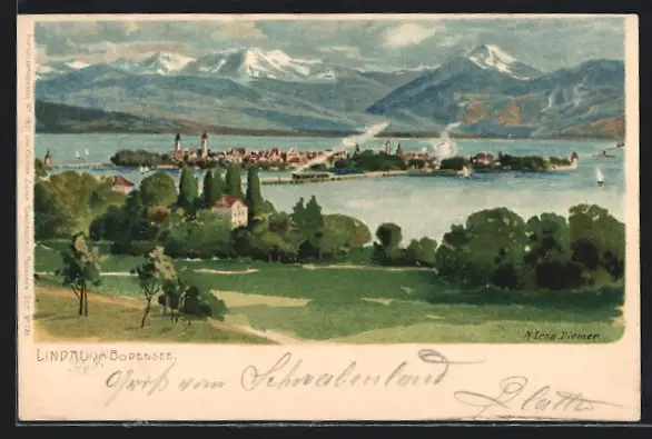 Künstler-AK Zeno Diemer: Lindau, Blick über die Insel mit Kirche