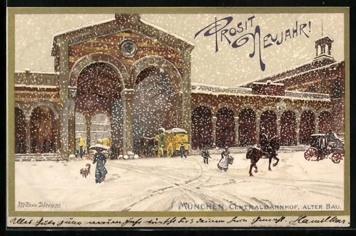 Künstler-AK Zeno Diemer: München, Zentralbahnhof, alter Bau im Winter, Neujahr, Postkutsche