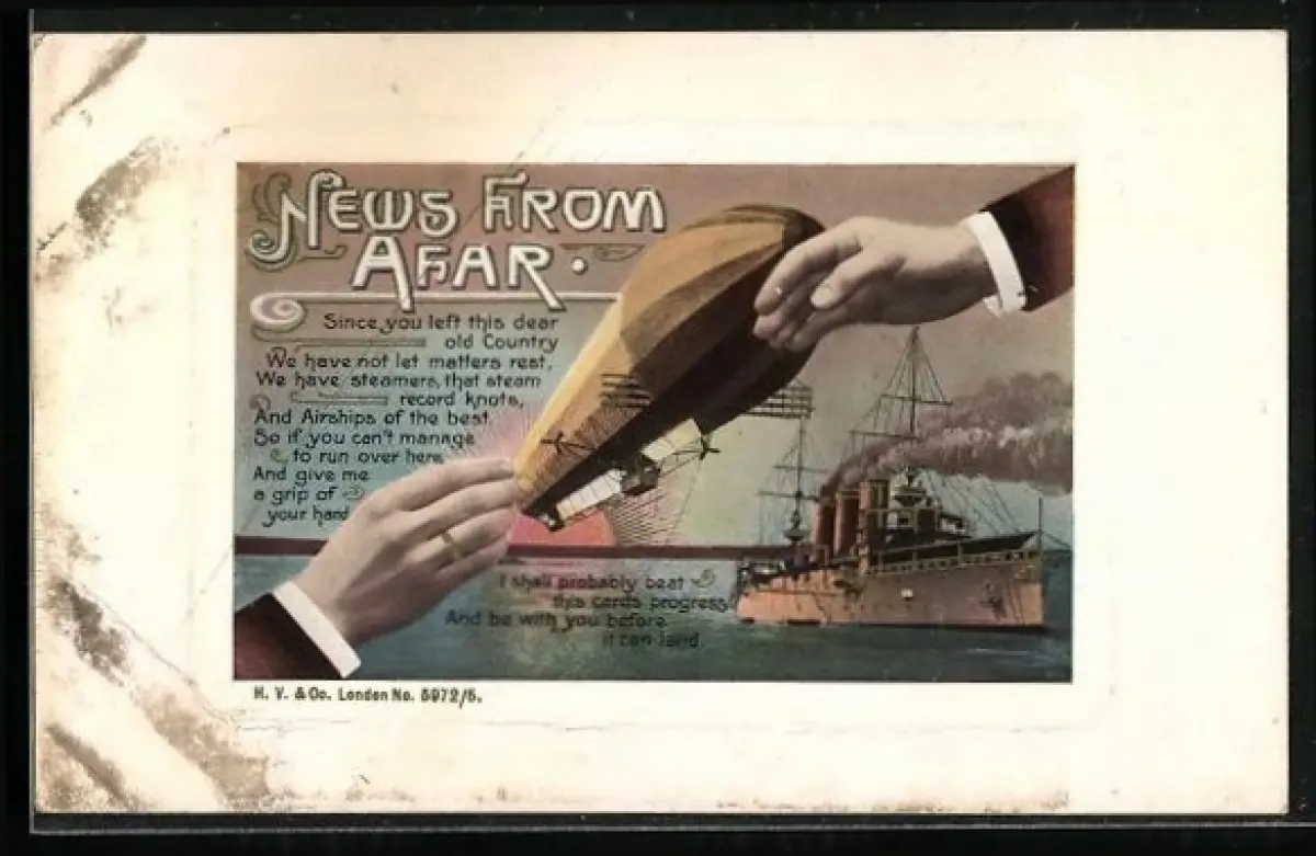 Künstler-AK Zeppelin und Dampfschiff, News from Afar