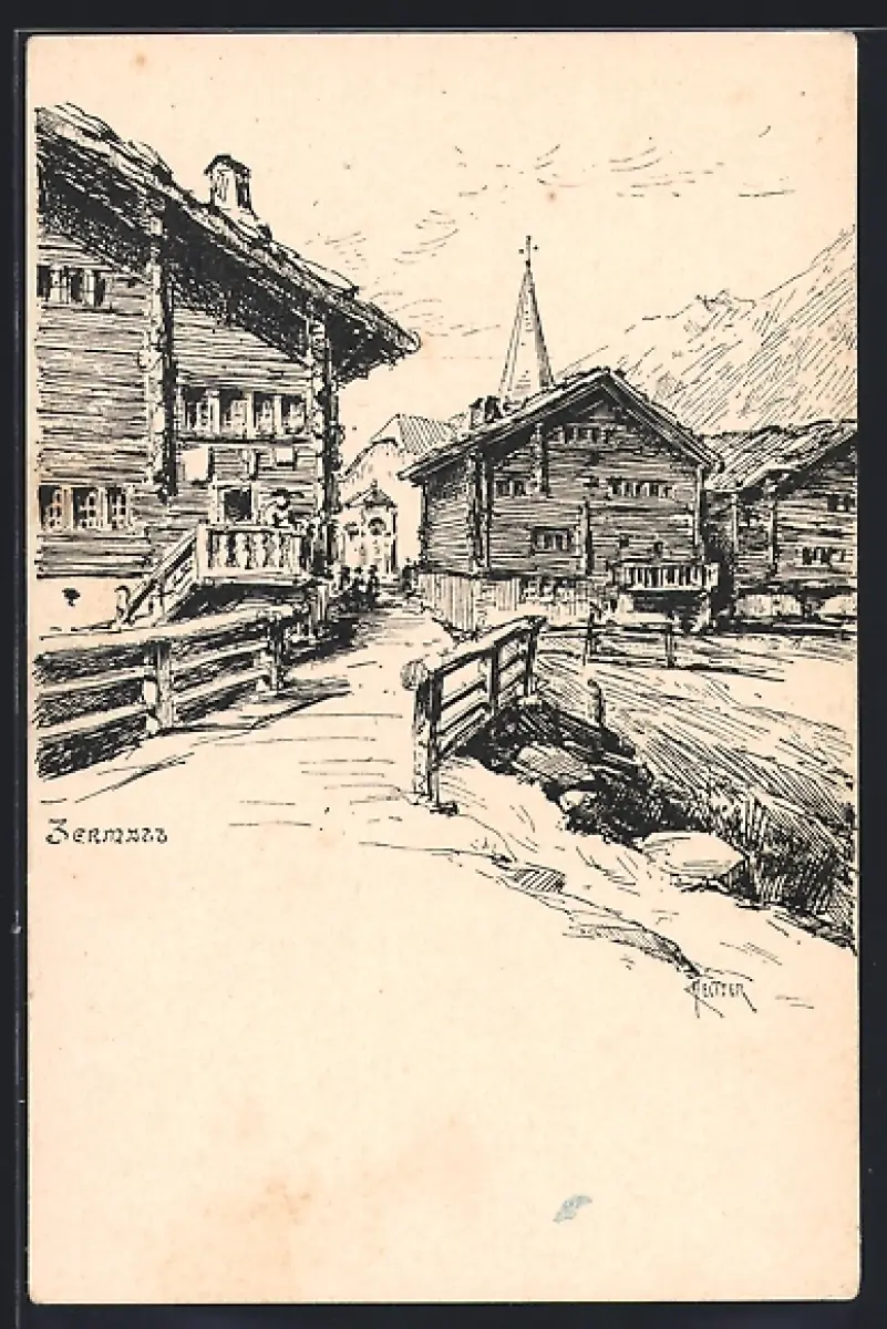 Künstler-AK Zermatt, Strassenpartie mit Gebäudeansicht