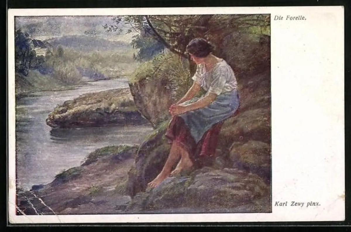 Künstler-AK Zewy, Die Forelle, Junge Frau sitzt am Flussufer auf den Felsen