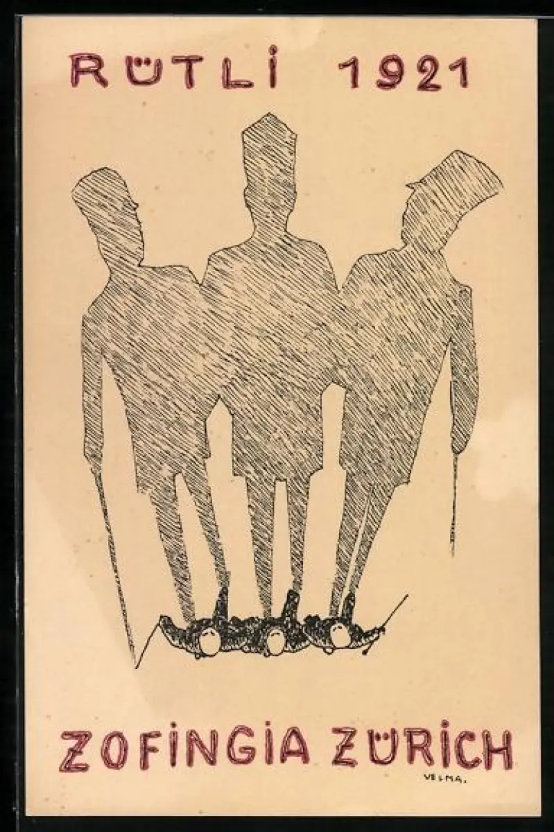 Künstler-AK Zürich, Rütli 1921, Drei Studenten werfen riesige Schatten