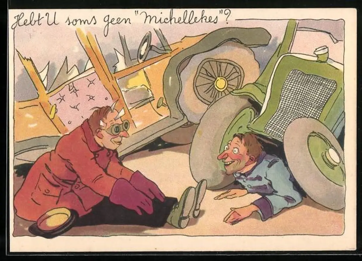 Künstler-AK Zwei Autofahrer nach einem Unfall