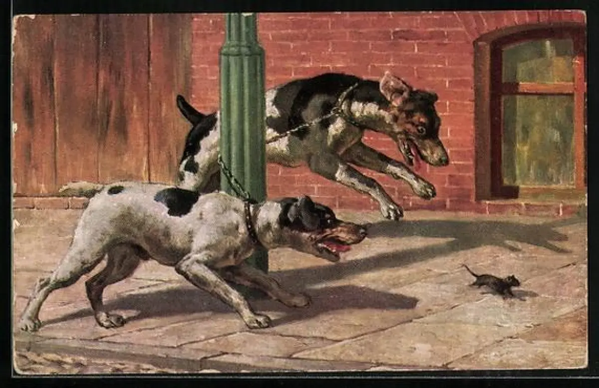 Künstler-AK Zwei Hunde kollidieren mit ihrer Kette am Laternenpfahl bei der Jagd nach einer Maus