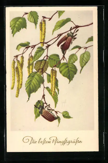 Künstler-AK Zwei Maikäfer an Birkenzweig mit Troddeln, Pfingstgruss