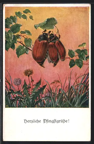 Künstler-AK Zwei Maikäfer auf einem Zweig, Pfingstgruss