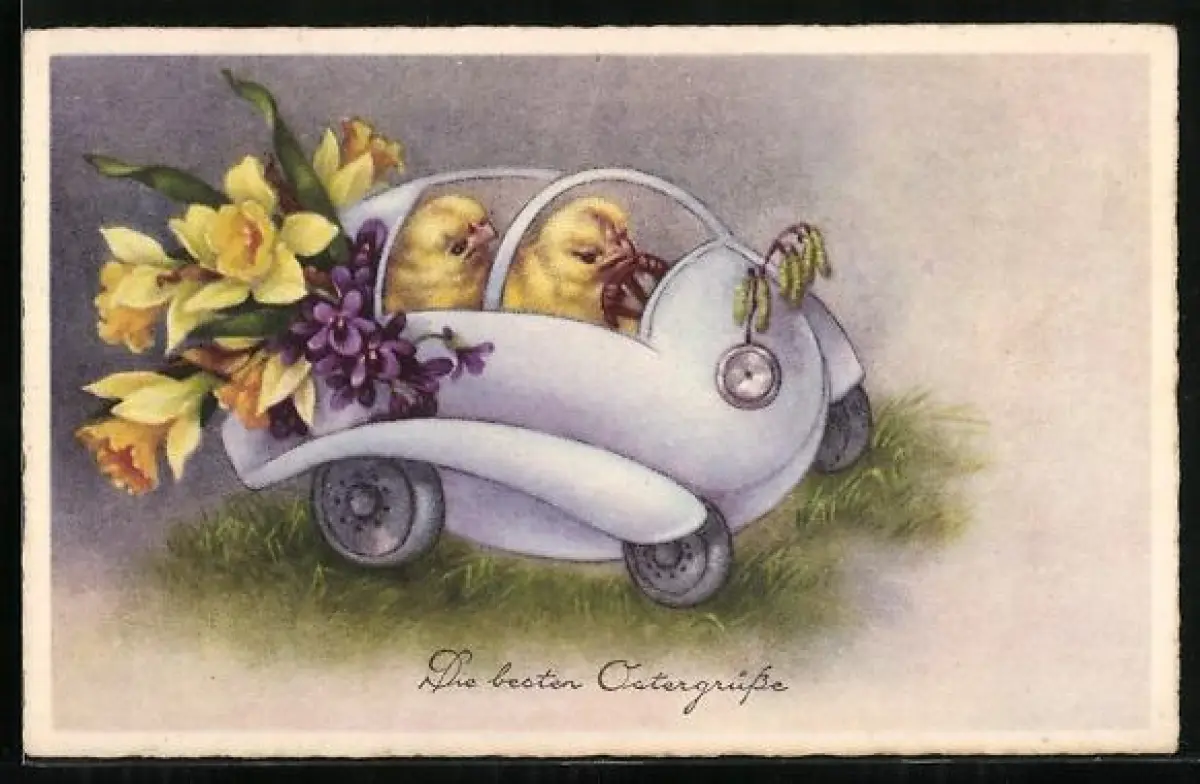 Künstler-AK Zwei Osterküken fahren in einem Eier-Auto mit Narzissen