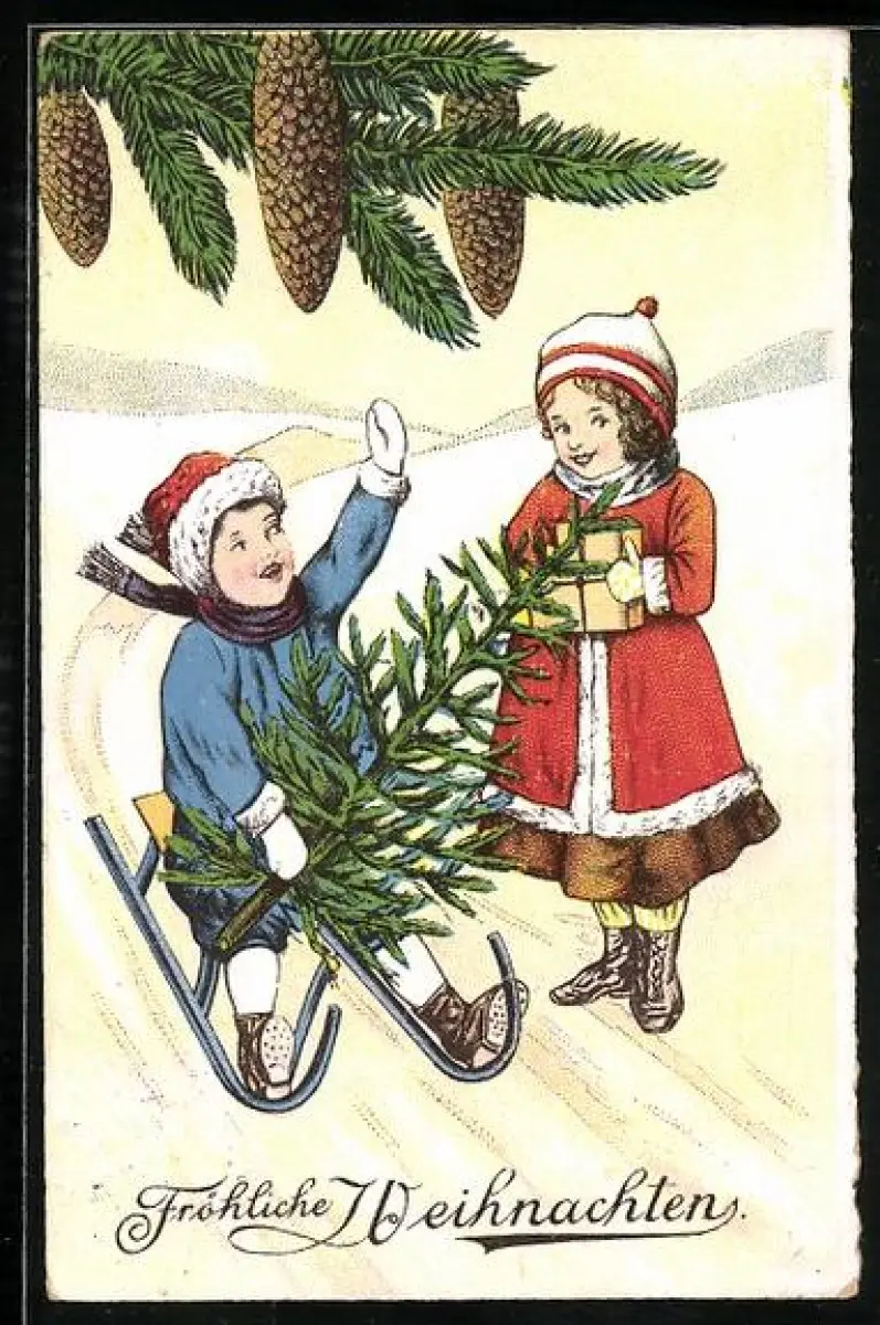 Künstler-AK Zwei kleine Kinder mit Tannenbaum und Schlitten