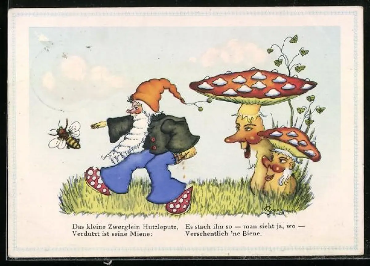 Künstler-AK Zwerg Hutzleputz mit Biene & Pilzen, Gedicht