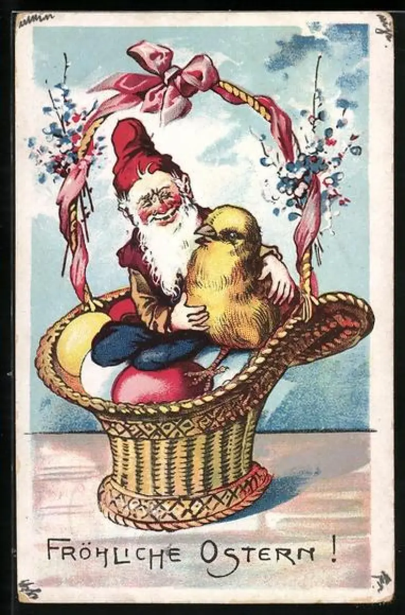 Künstler-AK Zwerg sitzt mit einem Osterküken in einem Korb voller Ostereier