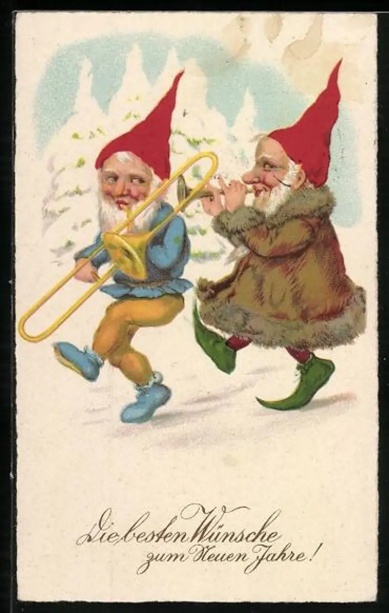 Künstler-AK Zwerge mit Blasinstrumenten im Schnee