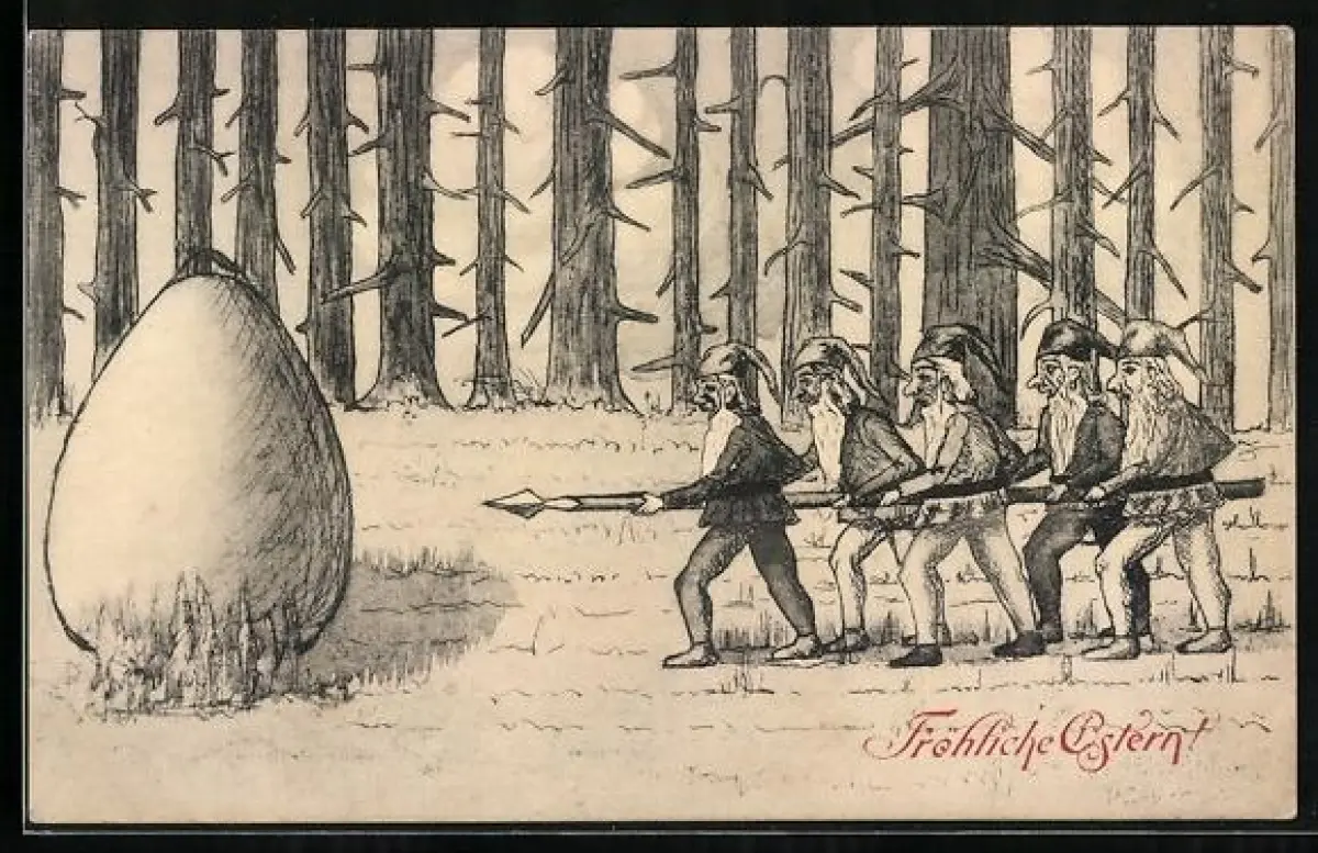 Künstler-AK Zwerge zielen mit einem Speer auf ein Osterei, Fröhliche Ostern