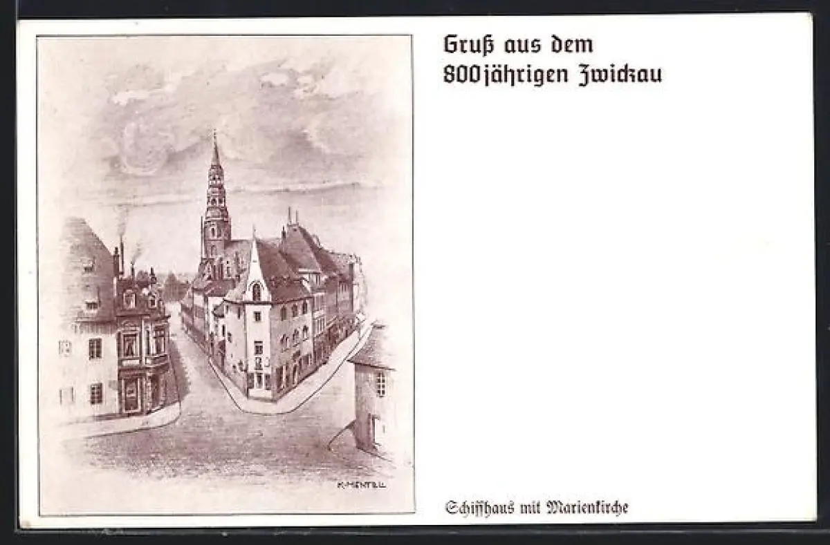 Künstler-AK Zwickau, Schiffhaus mit Marienkirche, Anlasskarte 800jähriges Jubiläum