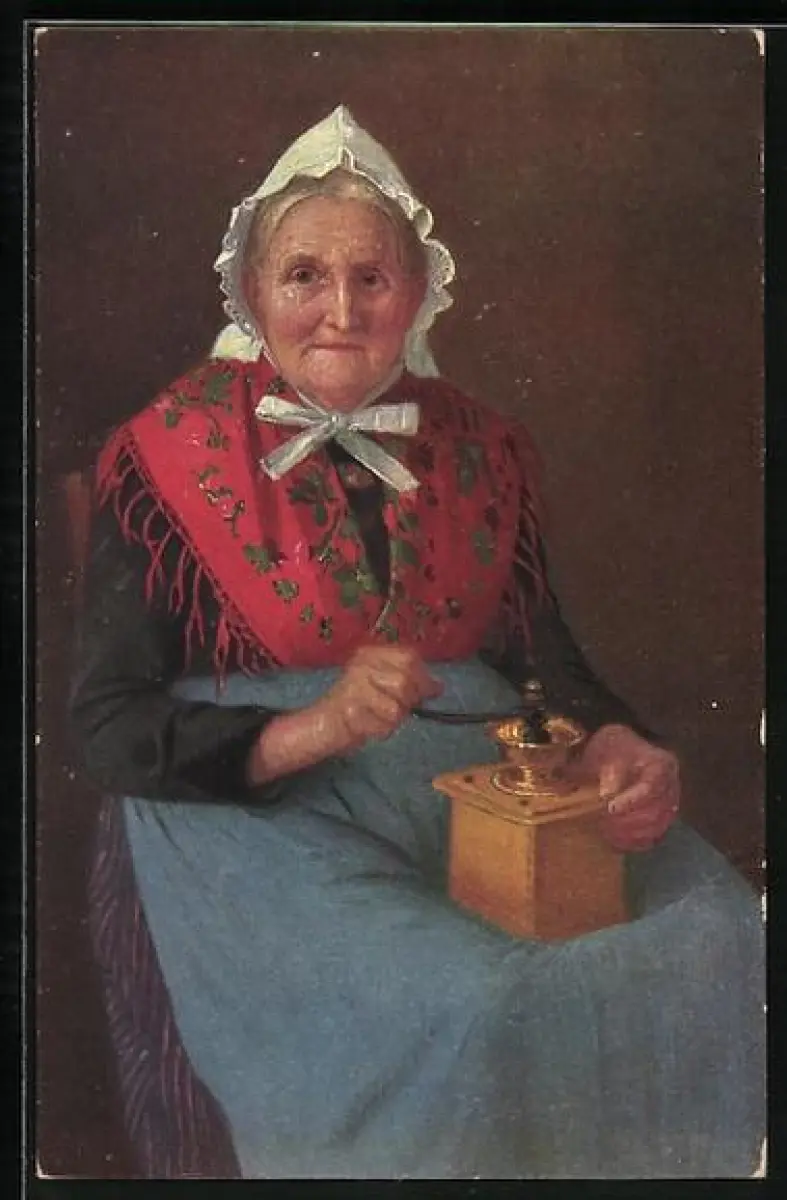 Künstler-AK alte Dame dreht eine Kaffeemühle