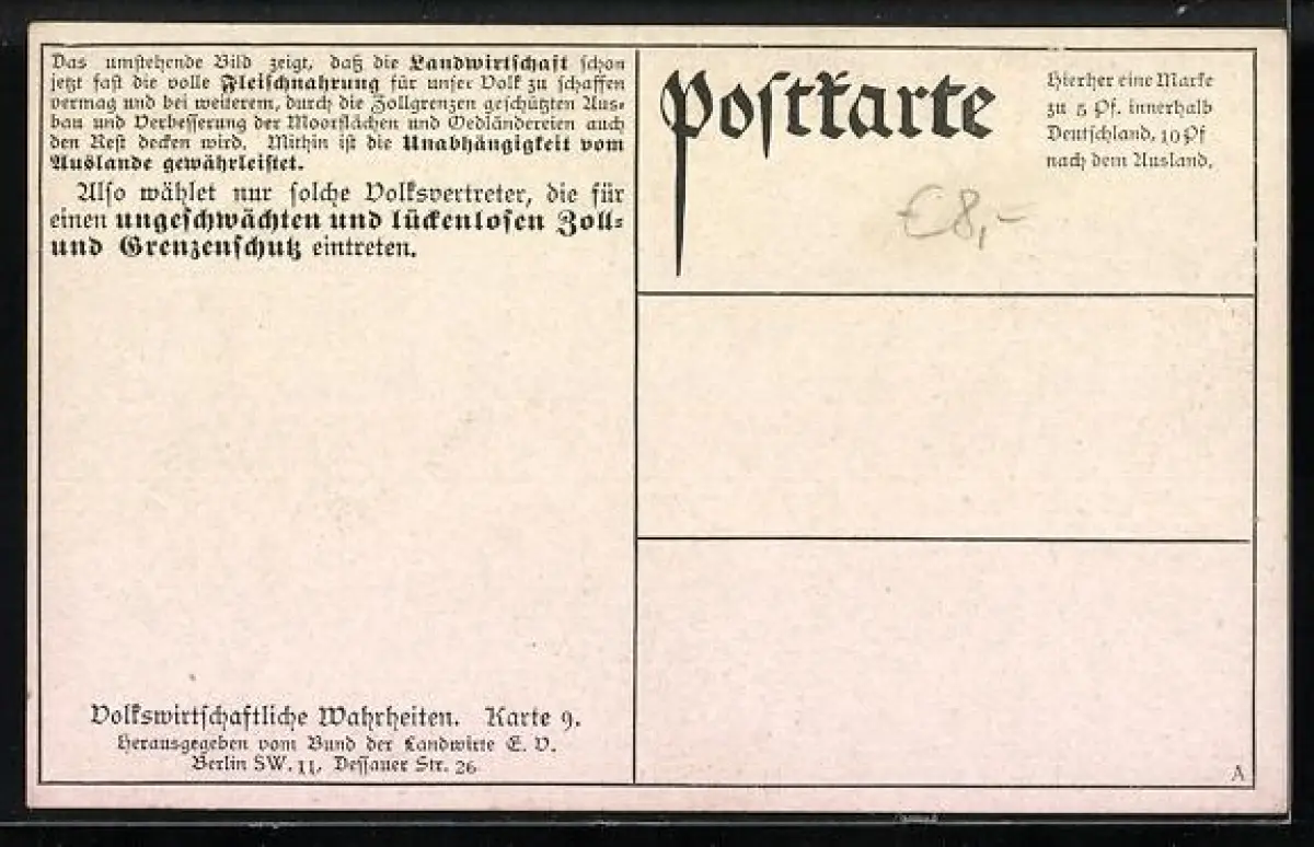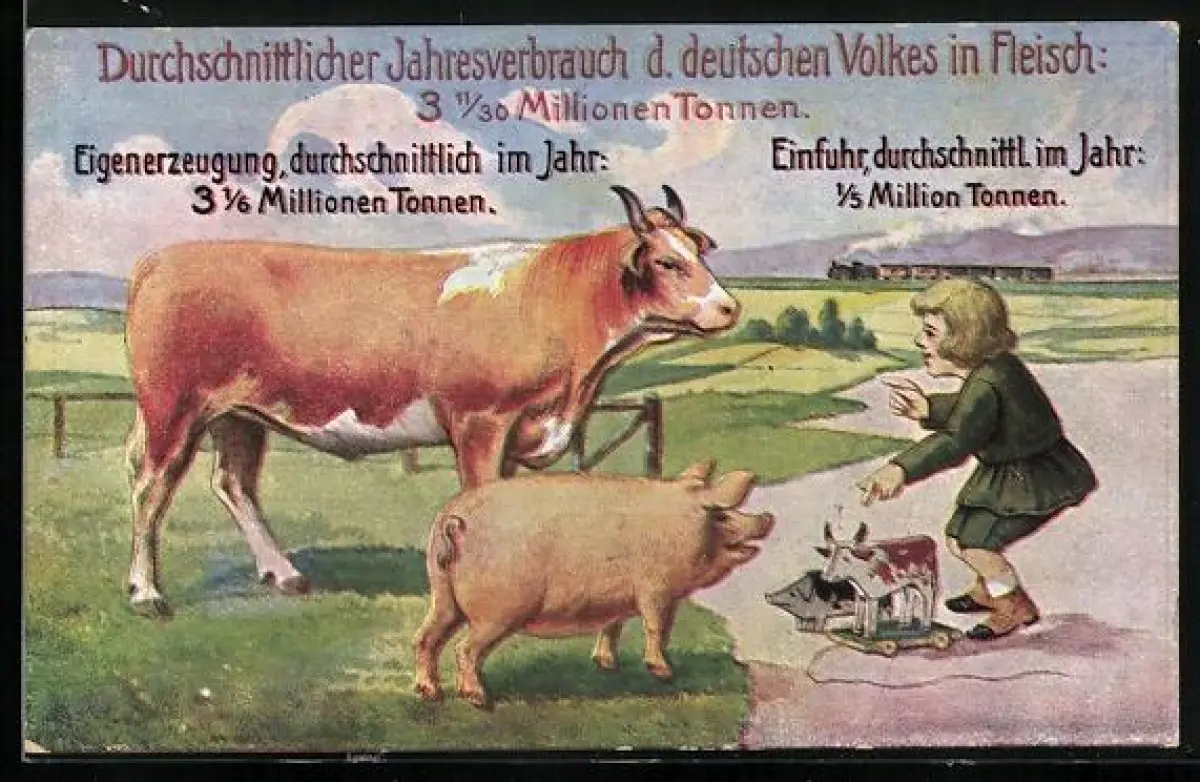 Künstler-AK durchschn. Jahresverbrauch d. deutschen Volkes in Fleisch, Knabe mit Spielzeug vor Schwein & Rind stehend