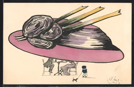 Künstler-AK ein Paar beim Rendezvous, die Dame mit riesigem Hut, beide verdeckend