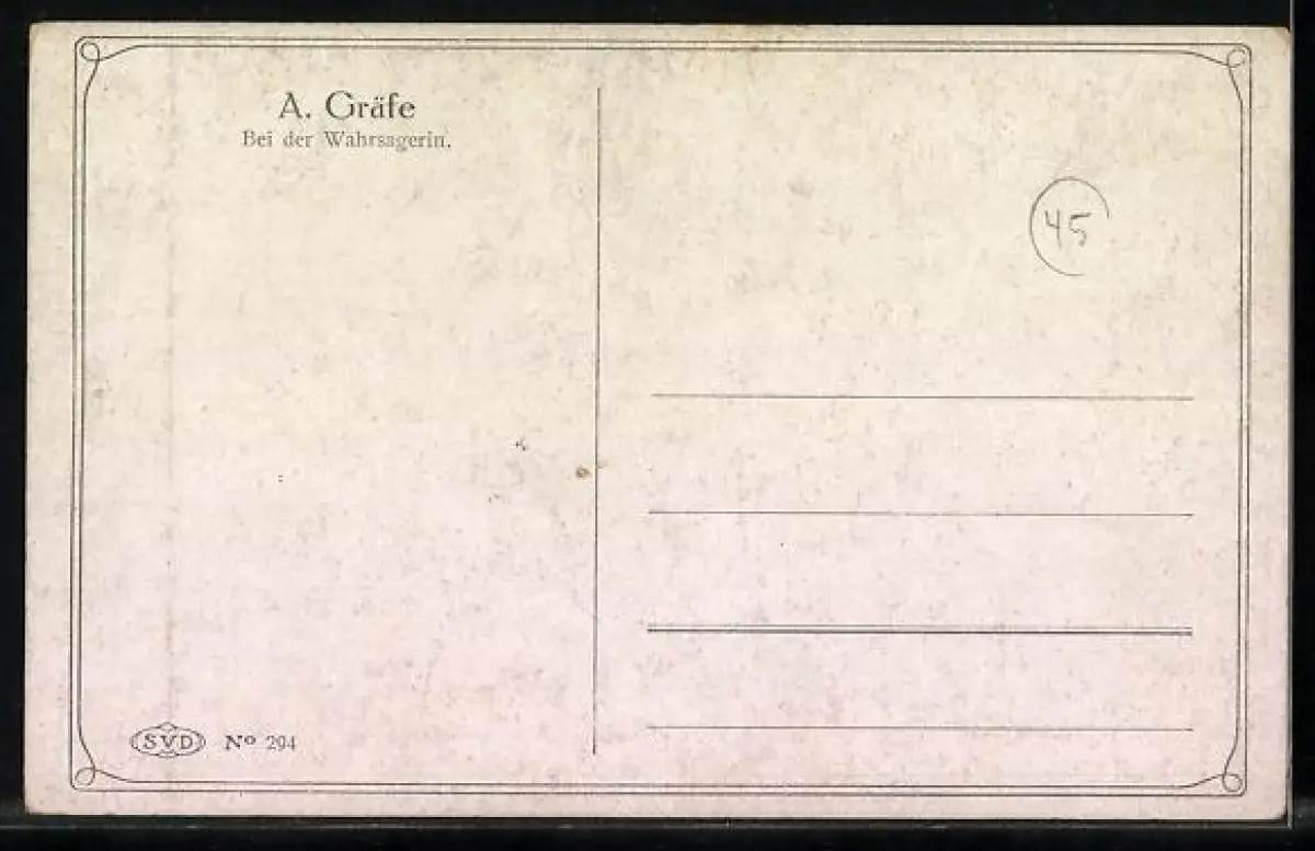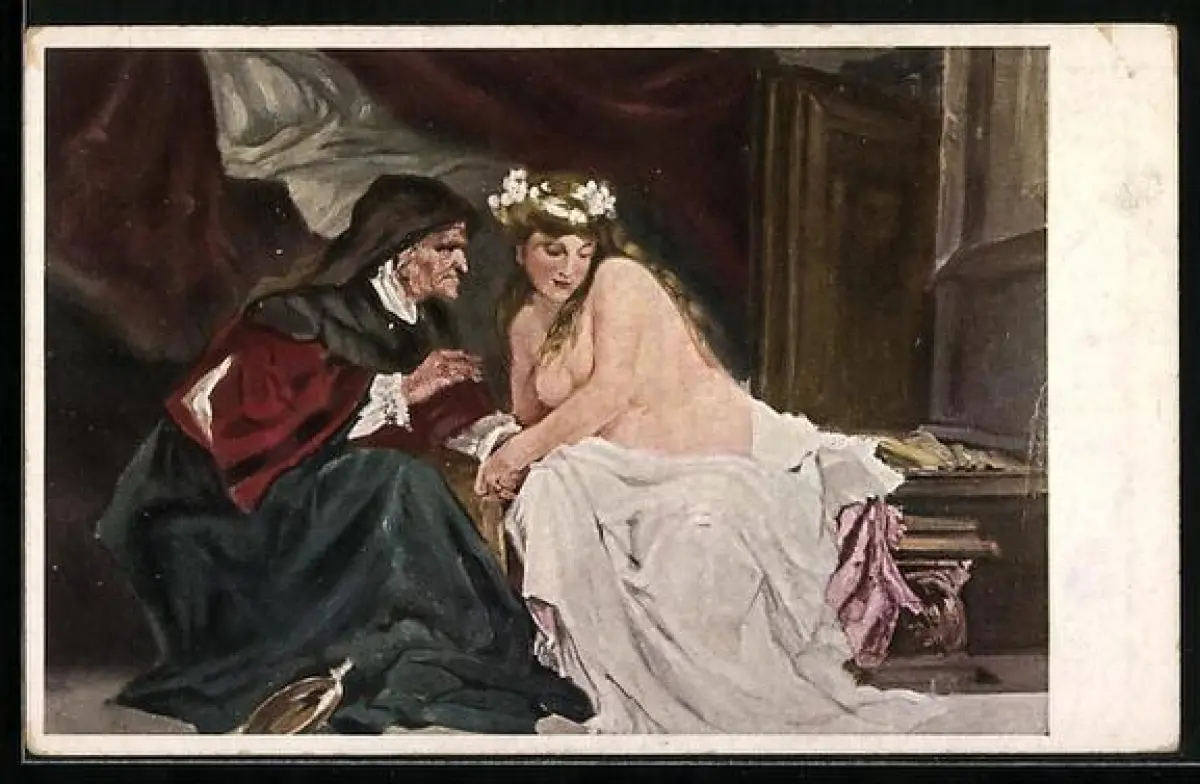 Künstler-AK junge Frau mit nackten Brüsten bei einer Wahrsagerin
