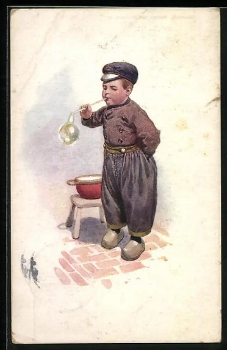 Künstler-AK junger Bursche spielt mit einer Seifenblase
