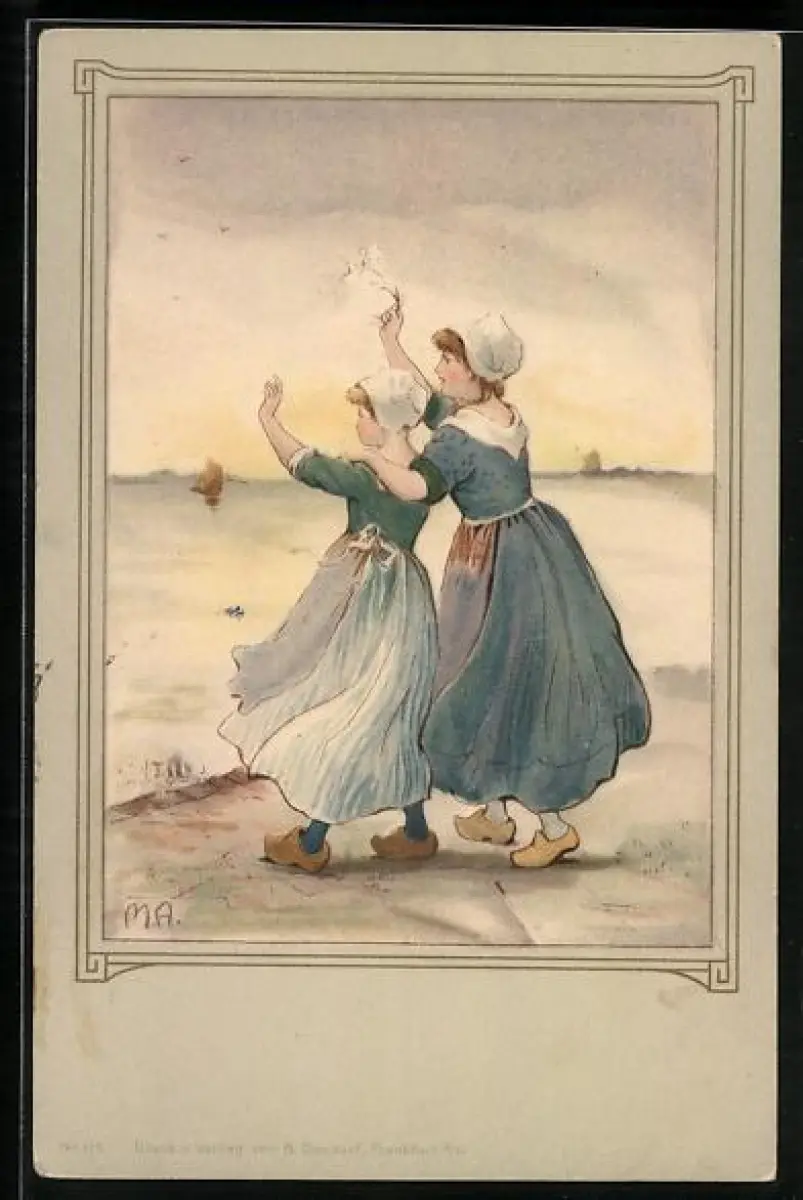 Künstler-AK niederländische Mädchen in Tracht winken jemanden zu
