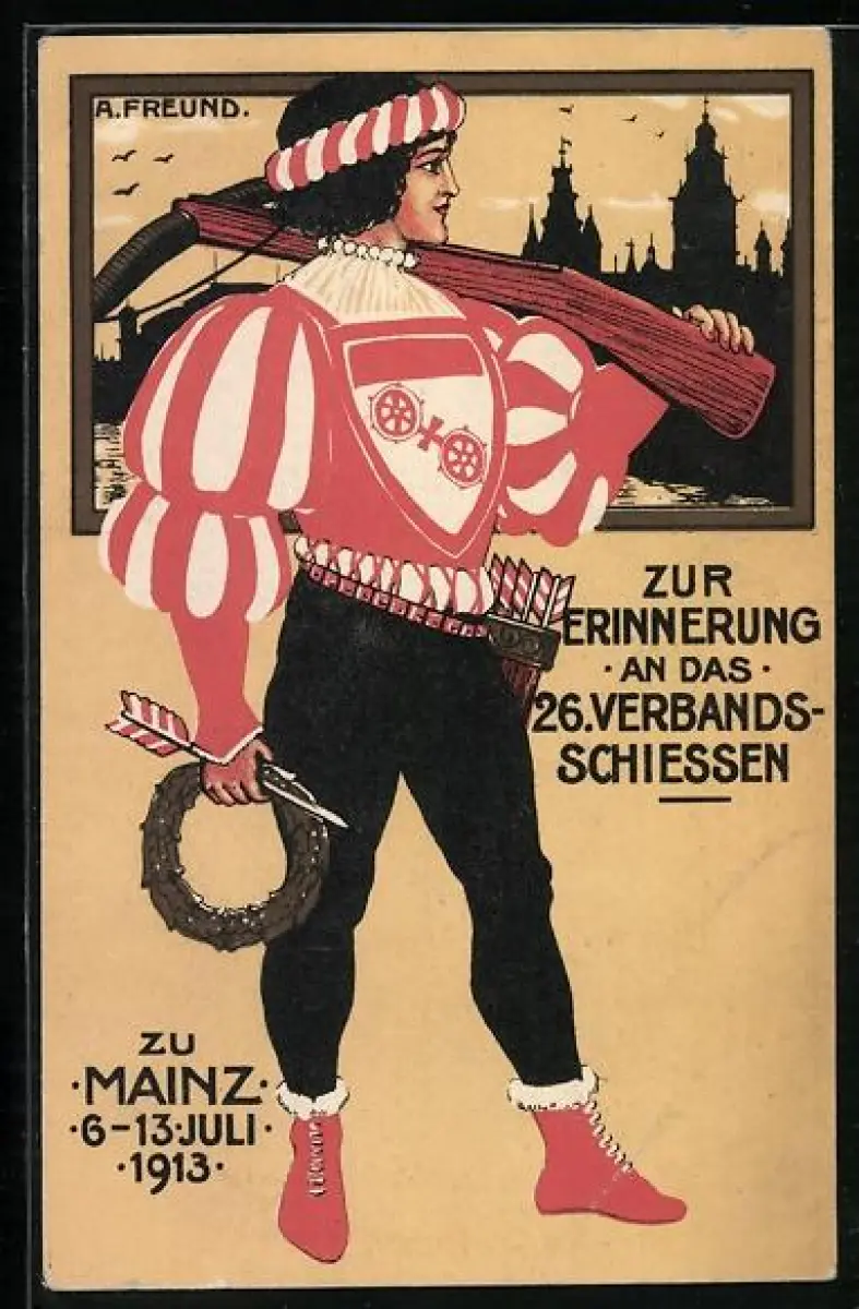 Künstler-AK sign. A. Freund: Mainz, 26. Verbandsschiessen 1913, Schütze mit Armbrust