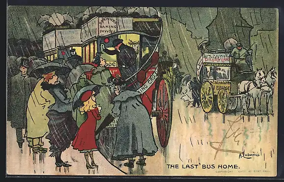 Künstler-AK sign. A. Ludovici: Busse und Passanten im nächtlichen Regen