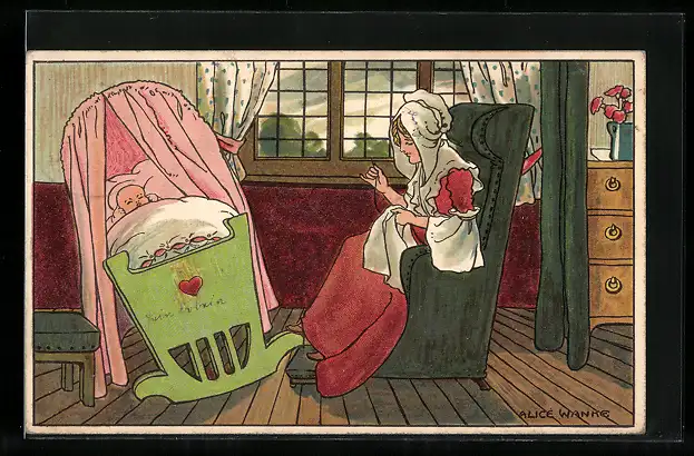 Künstler-AK sign. Alice Wanke: Mutter schaukelt beim Nähen die Babywiege