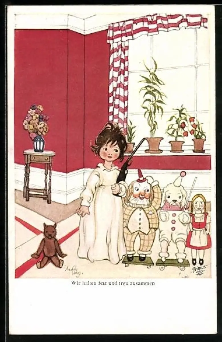 Künstler-AK sign. Anny Engelmann: Mädchen mit Puppen und Spielzeuggewehr