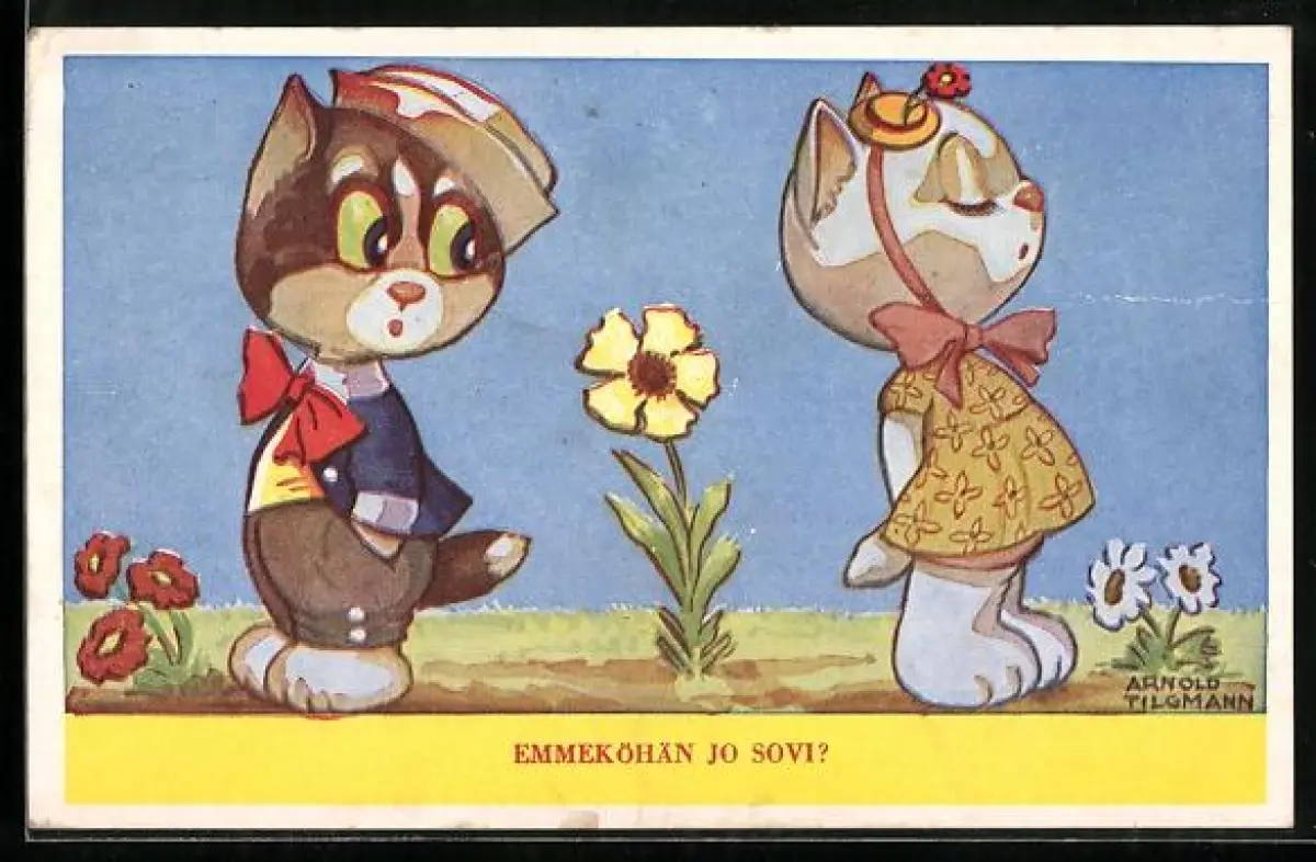 Künstler-AK sign. Arnold Tilgmann: vermenschlichte Katzen als Liebespaar, Katze wendet sich von ihrem Geliebten ab