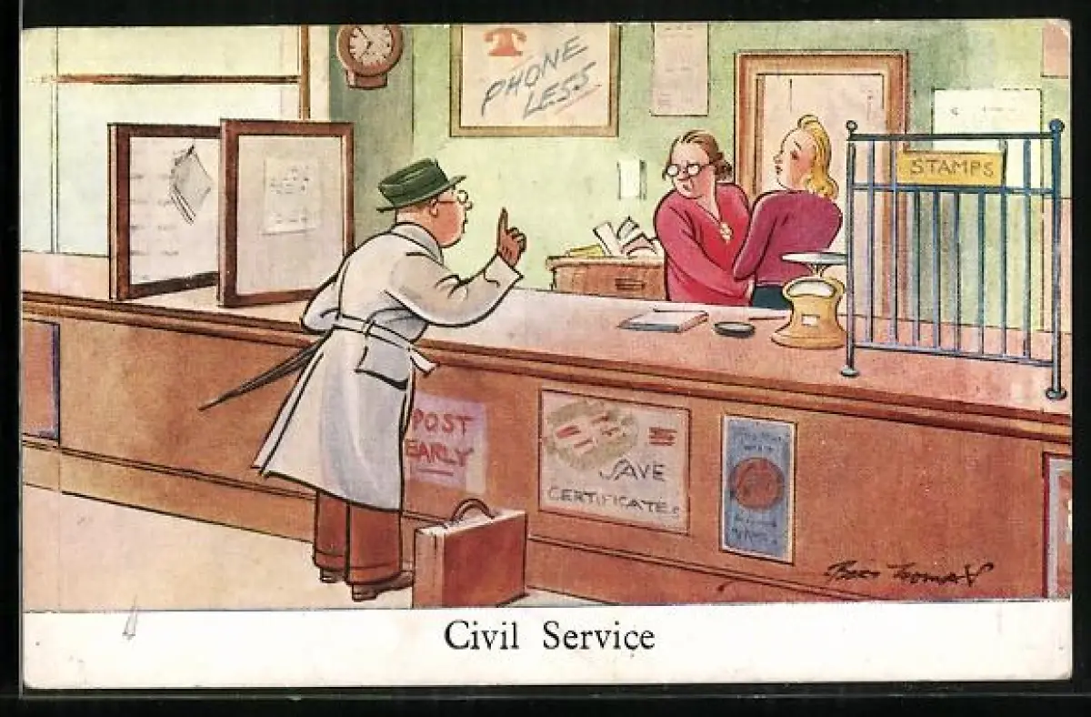 Künstler-AK sign. Bert Thomas: Mann wartet im Postamt auf eine Mitarbeiterin