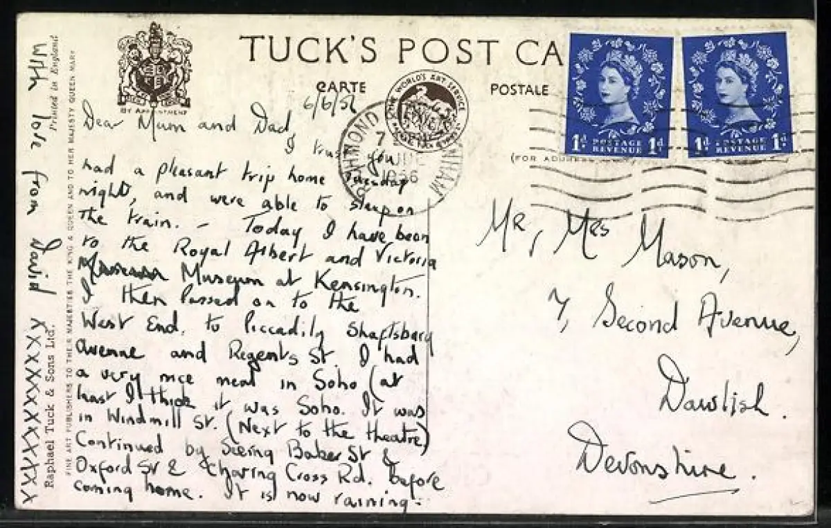 Personenbezogene Daten auf der Rückseite der Karte wurden durch blauen Textmarker unkenntlich gemacht. Die blauen Stellen sind auf die Vorderseite durchgeweicht und wirken sich negativ auf das Postkartenfoto aus