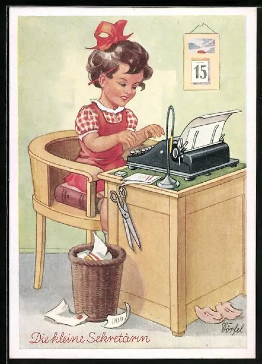 Künstler-AK sign. Dörfel: Die kleine Sekretärin, Mädchen an der Schreibmaschine