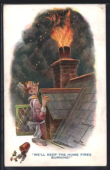 Künstler-AK sign. Dudley Buxton: Frau erblickt brennenden Schornstein