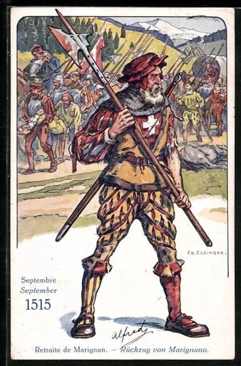 Künstler-AK sign. Ed. Elzingre: Der Schweizer Soldat im Laufe der Jahrhunderte, Rückzug von Marignamo, September 1515