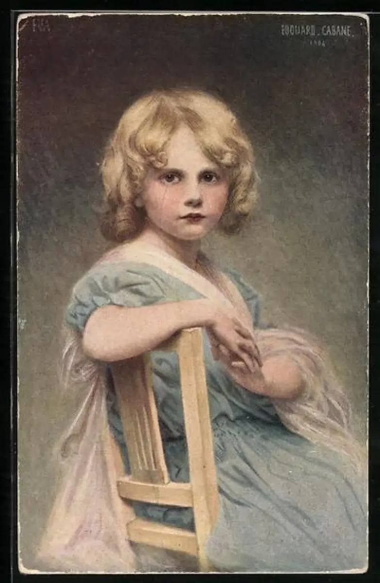 Künstler-AK sign. Edouard Cabane: junges Mädchen in blauem Kleid auf einem Stuhl