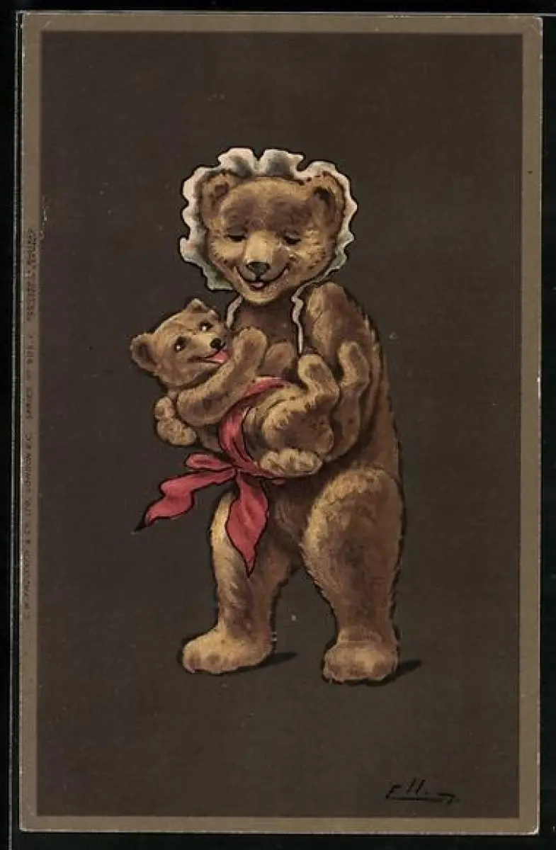 Künstler-AK sign. Ellam: Teddymutter mit Kind auf dem Arm