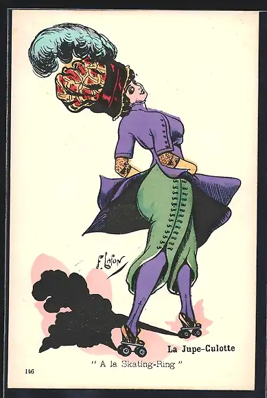 Künstler-AK sign. F. Lafon: Dame in festlichem Zwirn auf Rollschuhen