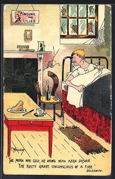 Künstler-AK sign. F. Macleoy: Mann friert beim Aufwachen