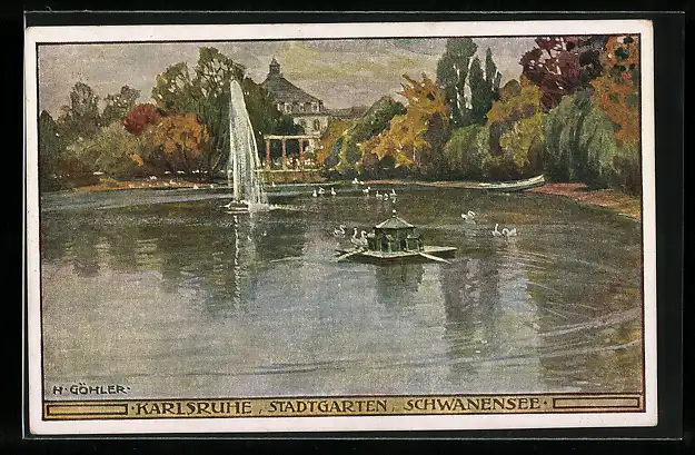 Künstler-AK sign. H. Göhler: Karlsruhe, Stadtgarten, Schwanensee, Schwäne