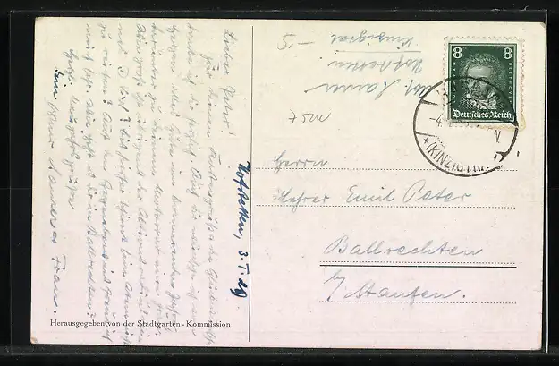 Personenbezogene Daten auf der Rückseite der Karte wurden durch blauen Textmarker unkenntlich gemacht. Die blauen Stellen sind auf die Vorderseite durchgeweicht und wirken sich negativ auf das Postkartenfoto aus