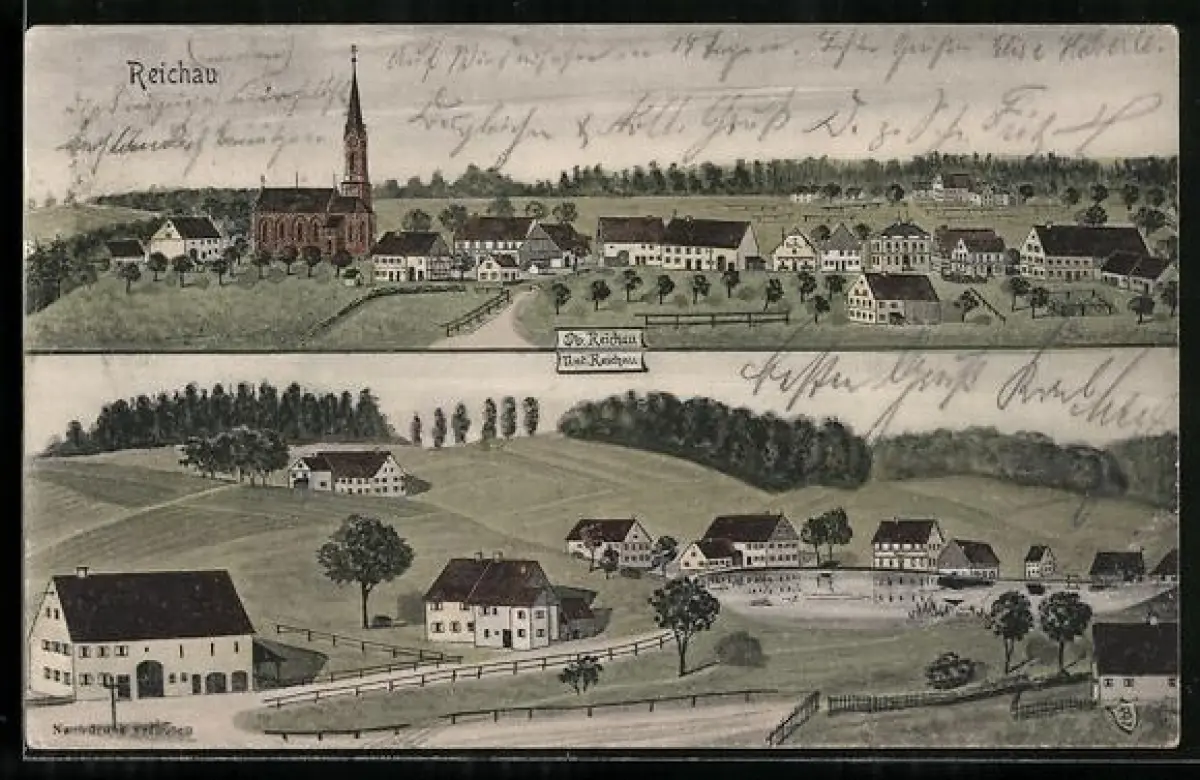 Künstler-AK sign. Hans Pernat: Reichau, Gesamtansicht mit Kirche und Umgebung
