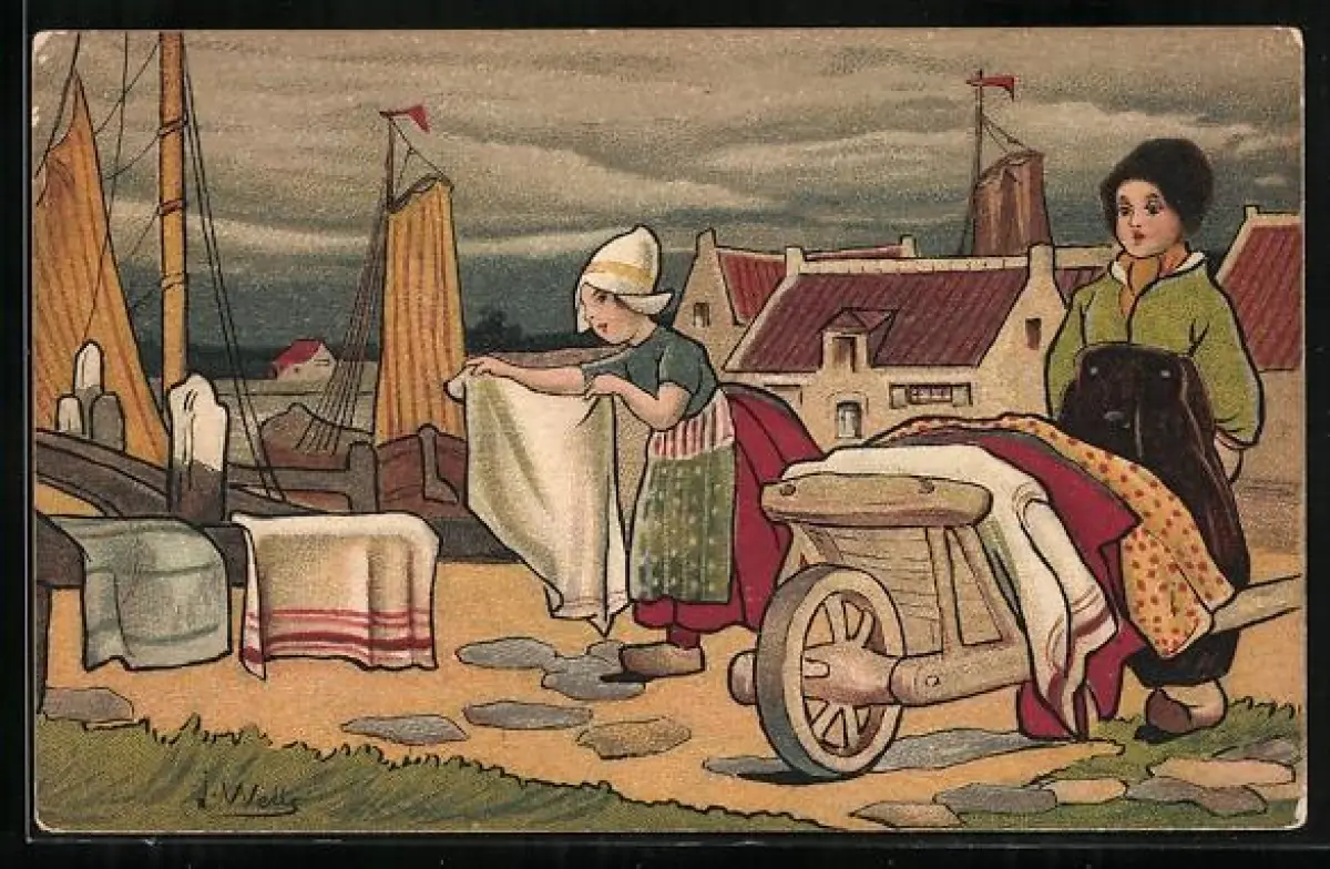 Künstler-AK sign. J. Wells: Mägde beim Aufhängen der Wäsche