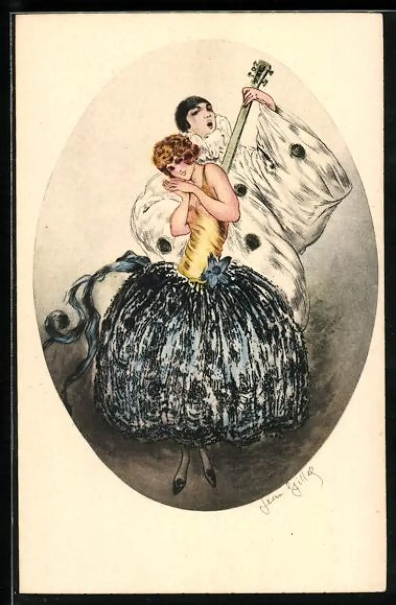 Künstler-AK sign. Jean Gilly: Junge Frau im Kleid, Mann spielt Gitarre