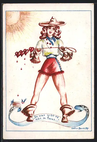 Künstler-AK sign. Jutta Bartsch: Frau mit Hut und Peitsche mit aufgespiessten Herzen