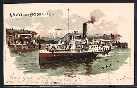 Künstler-AK sign. K. Fuchs: Bodenseedampfer König Karl im Hafen