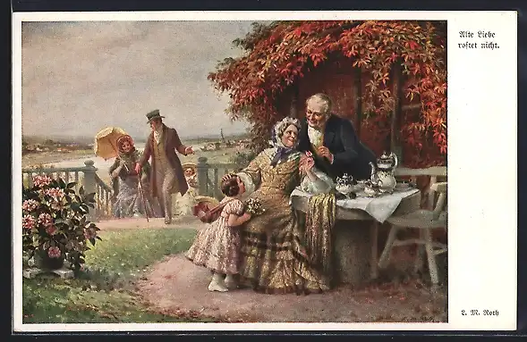 Künstler-AK sign. L. M. Roth: Alte Liebe rostet nicht, Älteres Paar im Garten