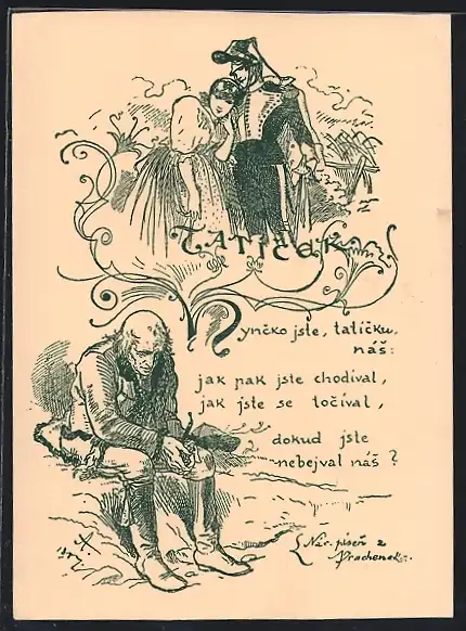 Künstler-AK sign. M. Ales: Alter Mann am Wegesrand, Soldat verabschiedet sich von seiner Liebsten