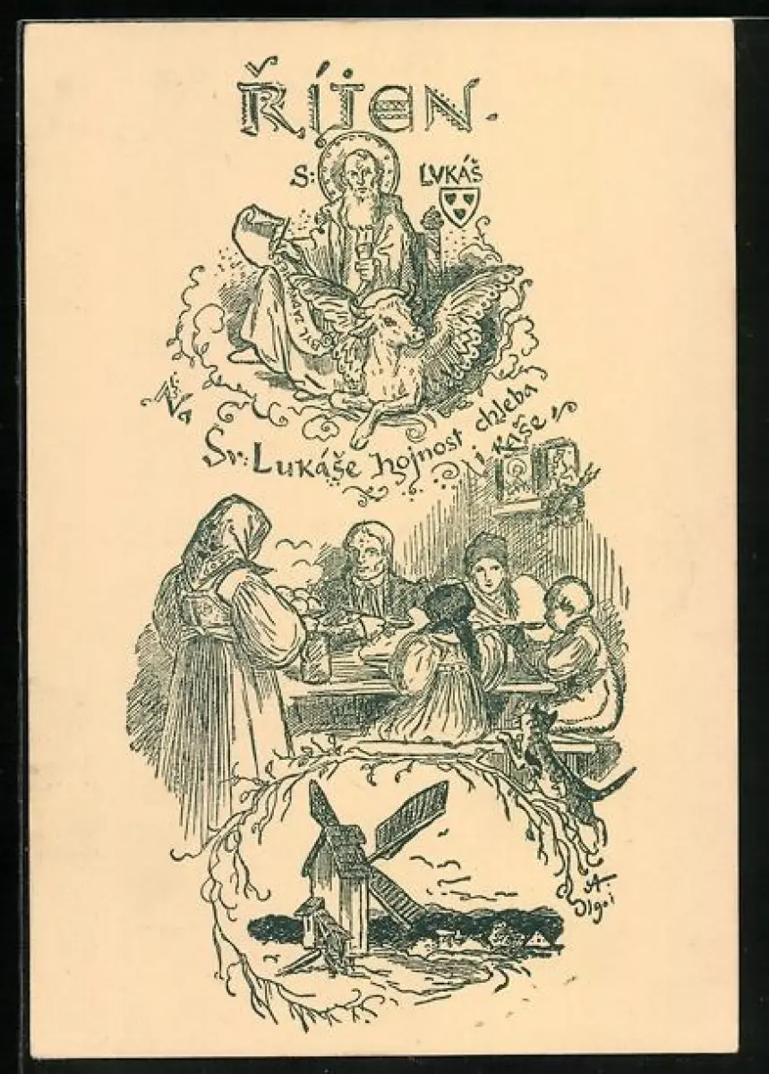 Künstler-AK sign. M. Ales: Familie sitzt bei einer Mahlzeit zusammen am Tisch, Windmühle in der Landschaft